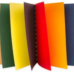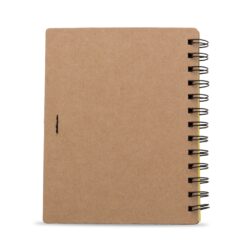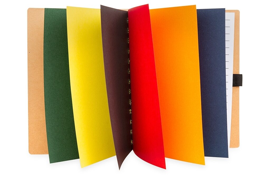Caderno ecológico com símbolo reciclado na capa, acompanha folhas coloridas estilo folhas de guarda nas cores: vermelho, amarelo, laranja, azul, verde e preto, possibilitando selecionar a cor desejada como fundo do logo reciclado. Possui aproximadamente 70 folhas brancas pautadas com logo reciclado na lateral inferior das folhas, possui também elástico suporte para caneta(não acompanha caneta).