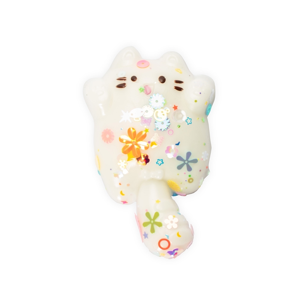 Brinquedo apertável antiestresse em formado de gato. Feito em borracha termoplástica com textura macia, adere facilmente a superfícies planas e acompanha bolinhas de pelúcia e lantejoulas para decoração.
