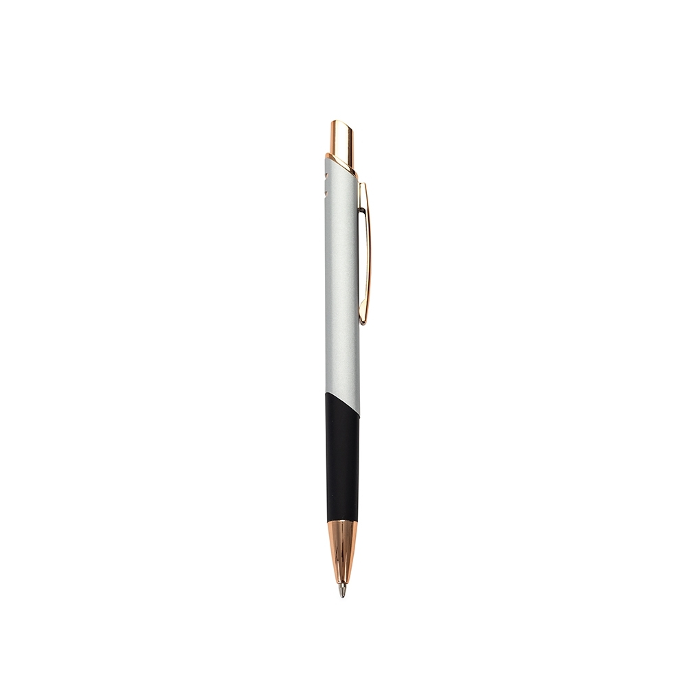 Caneta feita inteiramente em metal com acionamento por clique e carga esferográfica azul de 1,0mm.