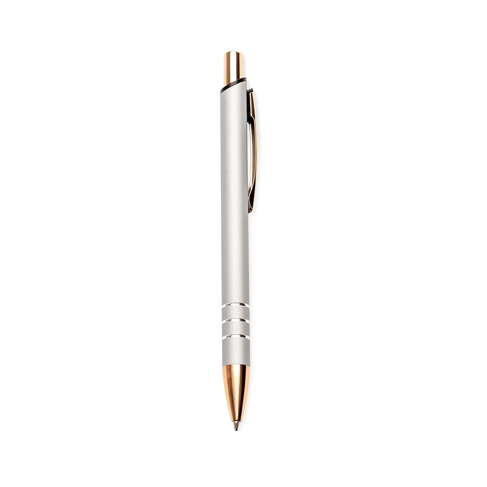 Caneta metálica com acionamento por clique e carga esferográfica azul de 1,0mm, oferecendo uma pegada leve para uma escrita mais precisa.