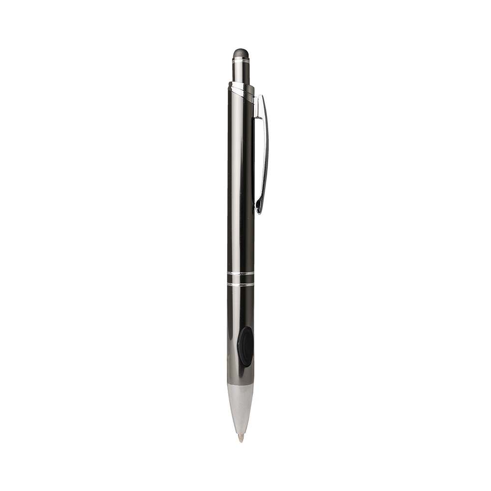 Caneta metálica com touchscreen, com detalhe emborrachado na parte inferior, carga esferográfica azul de 1.0 mm e acionamento por clique.