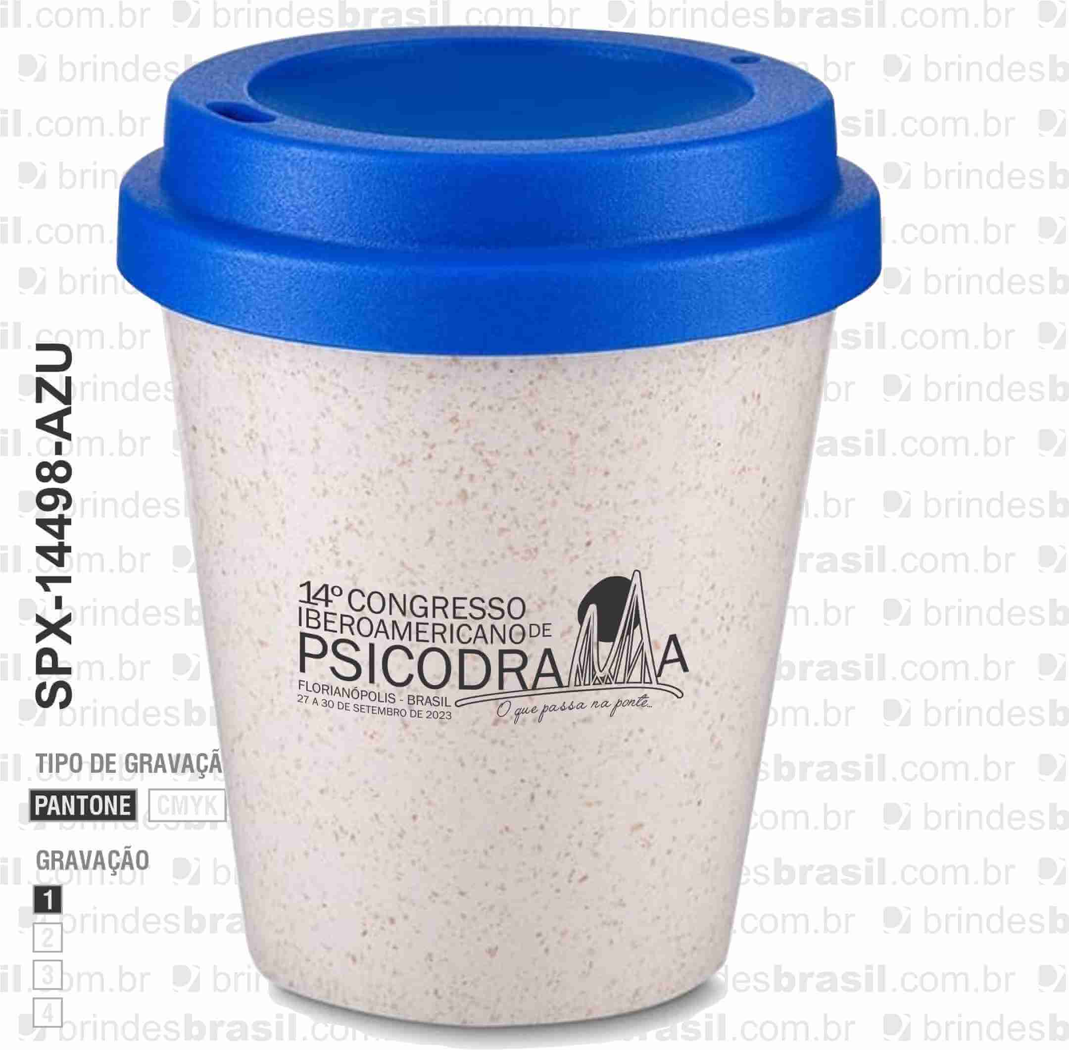 Copo em fibra de arroz biodegradável com capacidade para até 350ml e tampa plástica rosqueável.