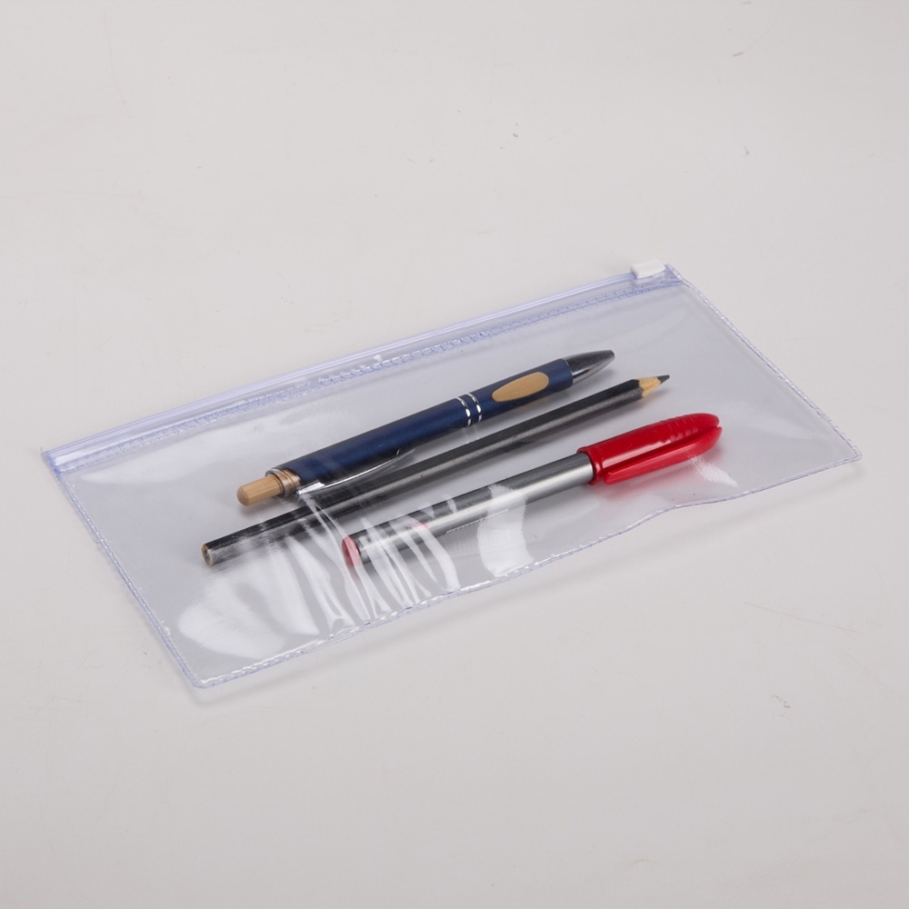 Estojo em plástico transparente com fechamento zip zap deslizante.