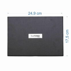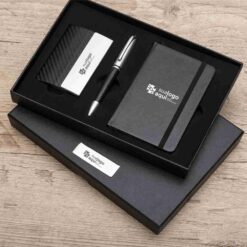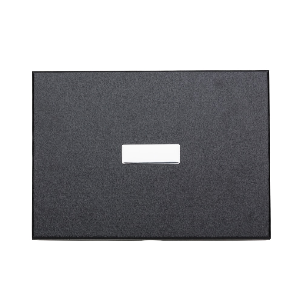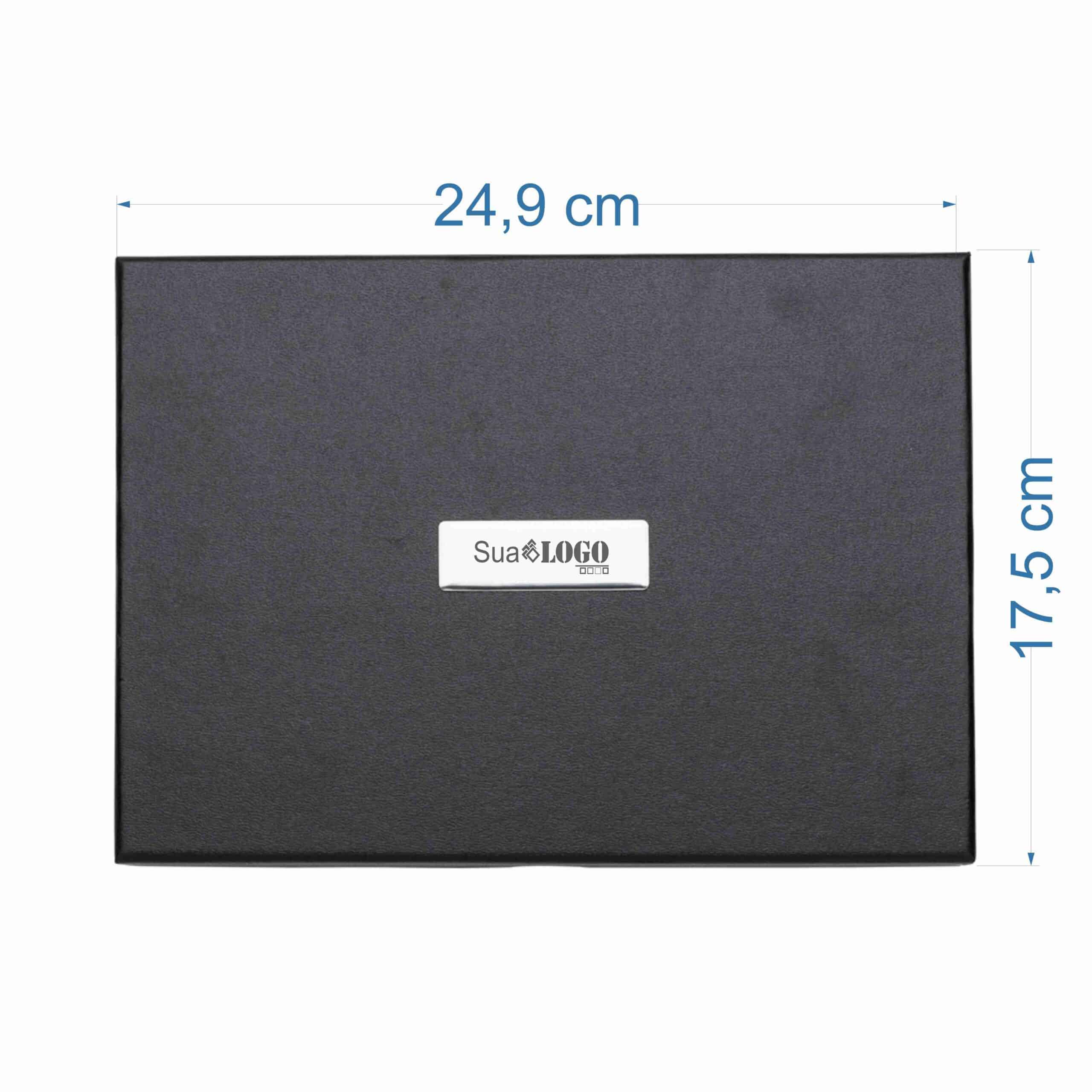 Kit executivo 3 peças em estojo de papelão com tampa e parte interna revestida de espuma. Contém: porta cartão de couro sintético texturizado com detalhes prata brilhante, caneta metal fosca com detalhe emborrachado preto, caderneta em couro sintético com aproximadamente 80 folhas amarelas pautadas. Acompanha placa metálica para gravação.